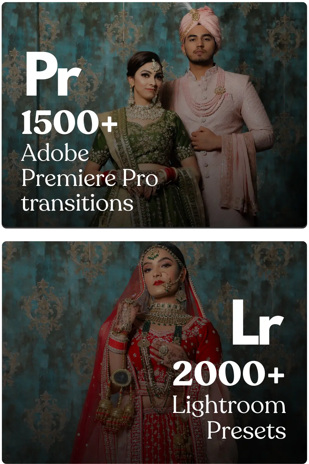 Over 50 packages including 2000+ Lightroom presets, 1500+ Premiere Pro transitions, 300+ wedding text logos, and more, providing all the tools you need in one bundle.